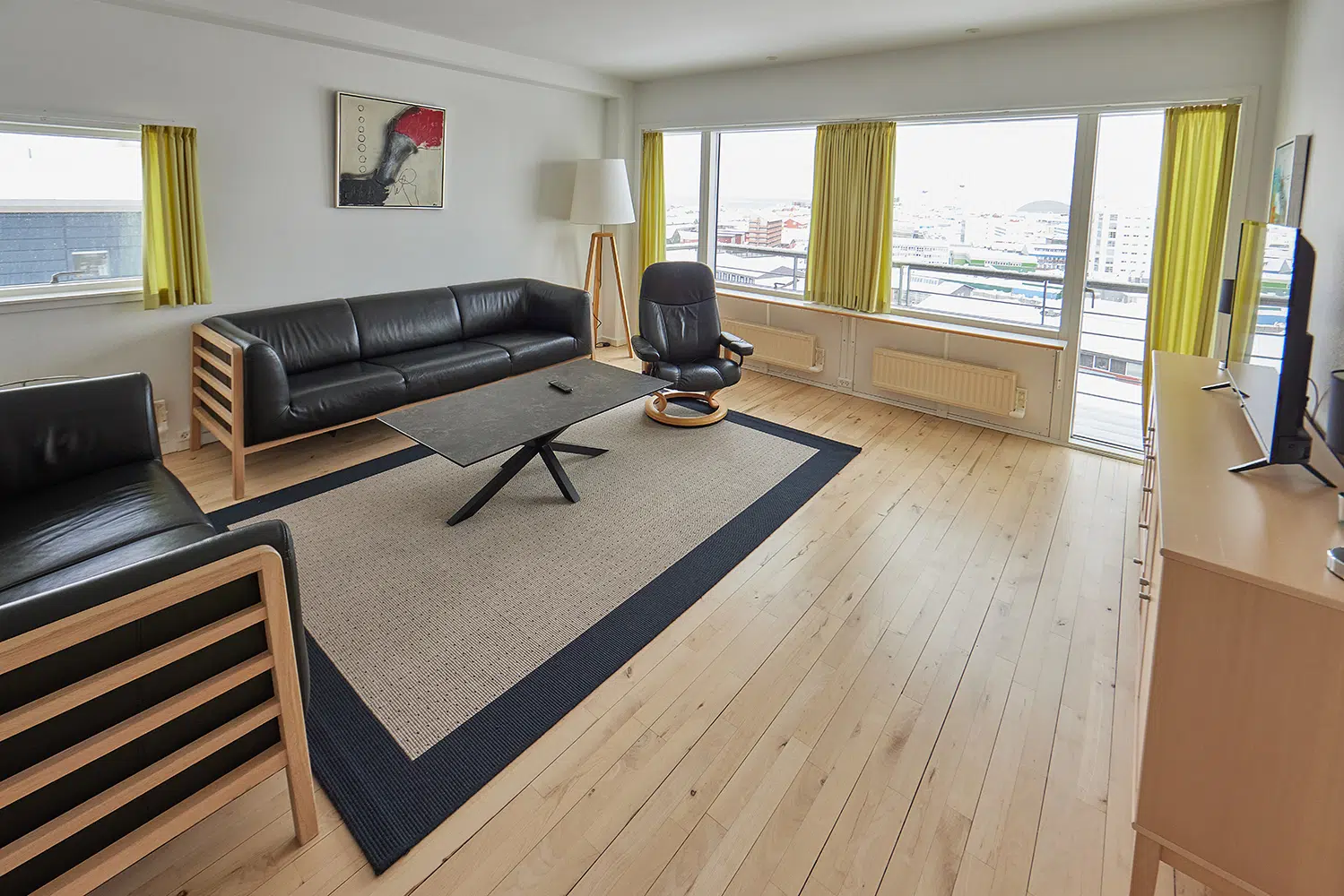 Eksklusiv penthouselejlighed med to separate soveværelser, loft-til-gulv vinduer og stor opholdsstue. Ideel for familier, ledere eller længere ophold, hvor komfort, udsigt og hjemlig ro vægtes højt.