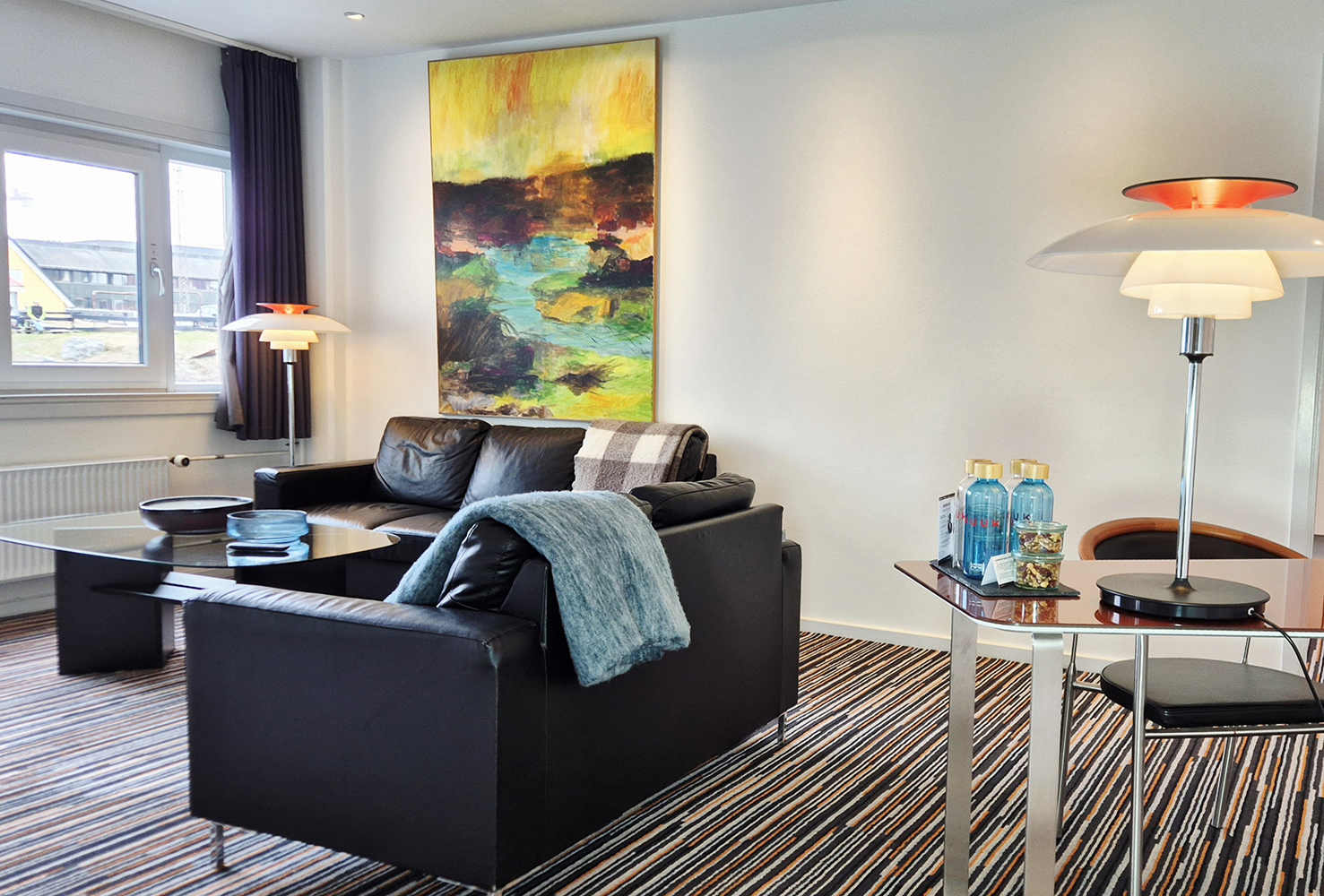Du kan også på 5. sal spise på restauranten A Hereford Beefstouw, hvor vi kombinere god mad, med det bedste indenfor dansk indretningsdesign og kunst på væggen fra kunstneren Peter Carlsen. Samtidig kan du nyde den mest fantastiske udsigt, ud over den fjorden, Nordlandet og Nuuk.